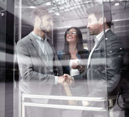 colleagues shaking hands in the elevator