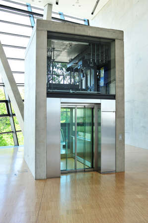 Lift with transparent glass doors in modern building