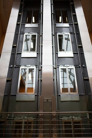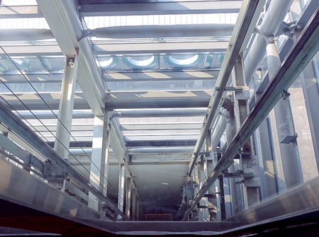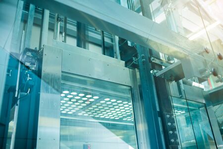 Glass elevator in a modern building close up bottom view