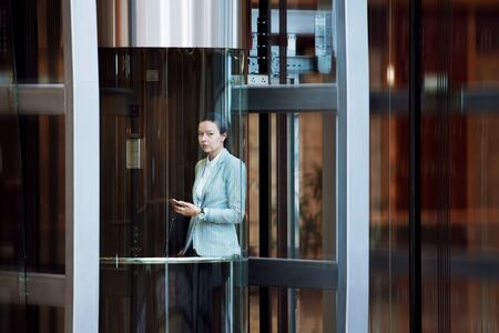 Young businesswoman in the Elevator . In the office or business center. Young woman in jacket and glasses works in a large company, ambitions and career growth