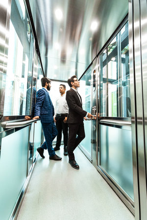 Business team group going on elevator. Business people in a large glass elevator in a modern office. Corporate businessteam and manager in a meeting.