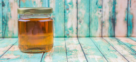 Honey in a mason jar over rustic weathered wooden background
