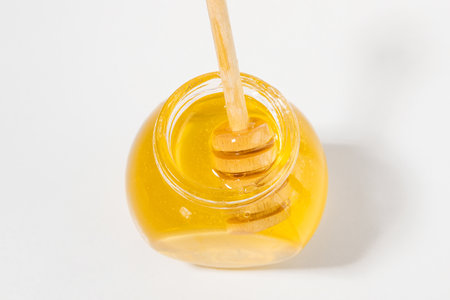 A honey jar with a wooden dipper, honeycomb piece, and drops against a white backdrop.