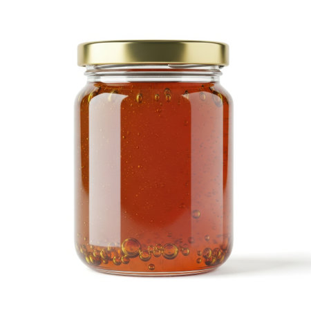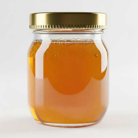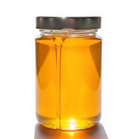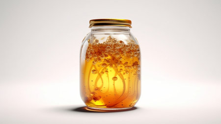 A captivating closeup of golden honey in a jar, perfect for culinary uses and showing health benefits