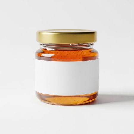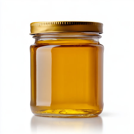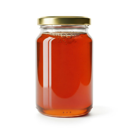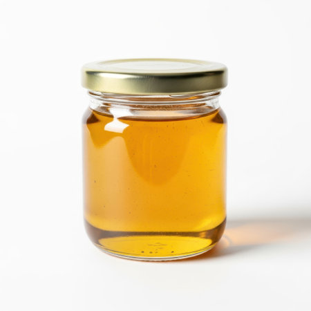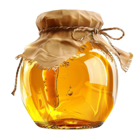 A delectable image of golden honey in a glass jar, perfect for food blogs, packaging, or culinary websites. This transparent PNG file features a pristine white background, showcasing the honey's rich amber hue and viscous texture. Its high-resolution detail and transparency make it ideal for diverse design projects.