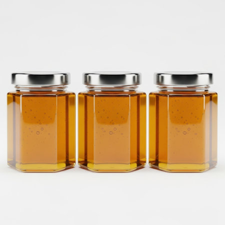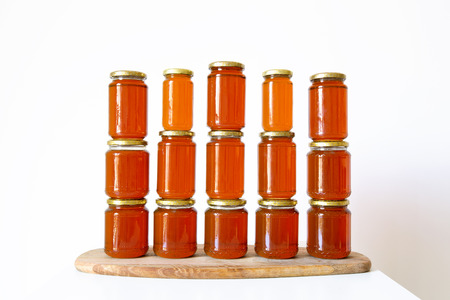 Jars of organic honey on a white background