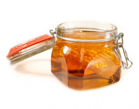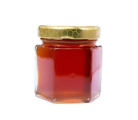 Opened Glass jar of honey with metal lid on table on a white background. Superfood, alternative sugar substitute.