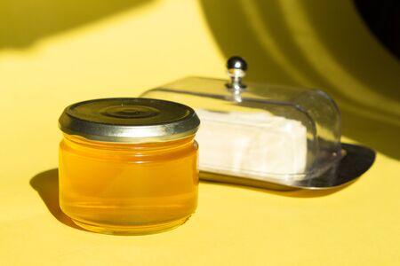 Natural sugar substitute, healthy food concept. Raw bee honey in glass jar on yellow background. Close-up of liquid organic honey. Selective focus.