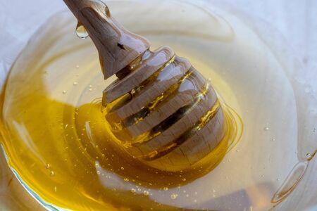 Wooden honey dipper with golden honey and air bubbles. Extreme close up, macro