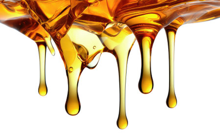 Thick golden syrup slowly drips, highlighting its smooth texture and rich amber color. The simplicity of the background emphasizes the syrups luscious appearance.