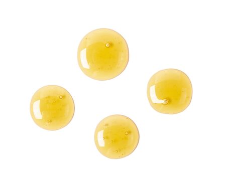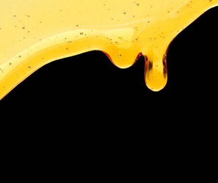 A drop of body gel or shampoo flowing down on a yellow saturated background. Texture.