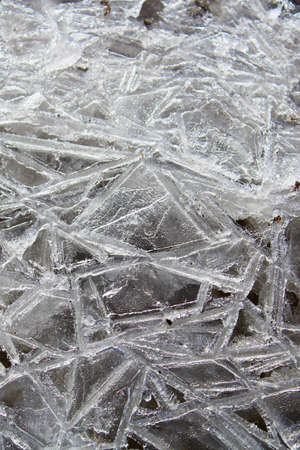 Close up of pieces of ice on frozen lake or river. Shatters of cracked ice closeup. Broken ice on the lake. Winter background.