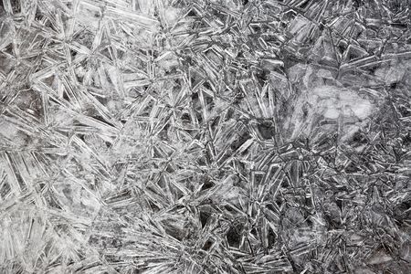 Texture of ice in the winter. Abstract background of frost for design, photographed closeup. A melting or freezing stream in late autumn or early spring.