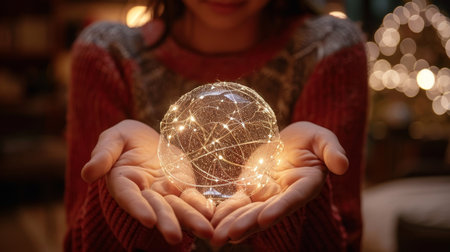 A glowing light bulb is held aloft, casting warm light in a tranquil atmosphere filled with soft, sparkling bokeh effects