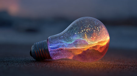 A rainbow-filled lightbulb glowing brilliantly in the dark, scattering delicate luminous particles in the surrounding atmosphere