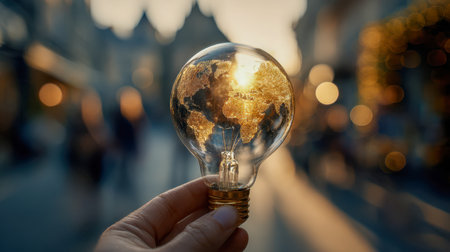 A person's hand gently cradles a luminous light bulb displaying a vibrant digital globe, representing worldwide progress and eco-friendly energy initiatives amidst a
