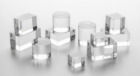 Various clear acrylic geometric shapes including cubes and cylinders are arranged on a white surface.