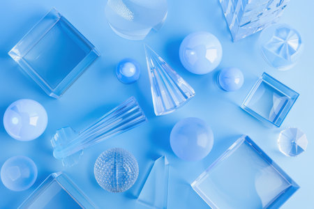 Background of glass elements, various geometric glass shapes.