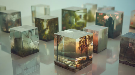 A collection of clear, floating cubes showcase vibrant seasonal and seaside scenery, creating an elegant, surreal display on a neutral gray canvas.