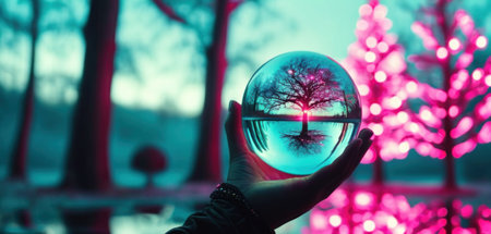 Hand holding crystal ball with tree inside and blurred bokeh background
