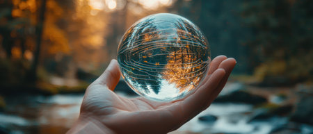 Crystal ball with reflection of forest and lake. Concept of environmental conservation.
