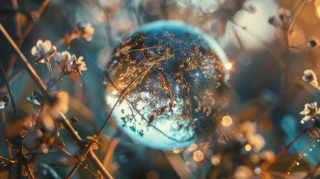 A lensball reflecting flowers and foliage in a magical setting, with bokeh lights and a dreamy atmosphere.