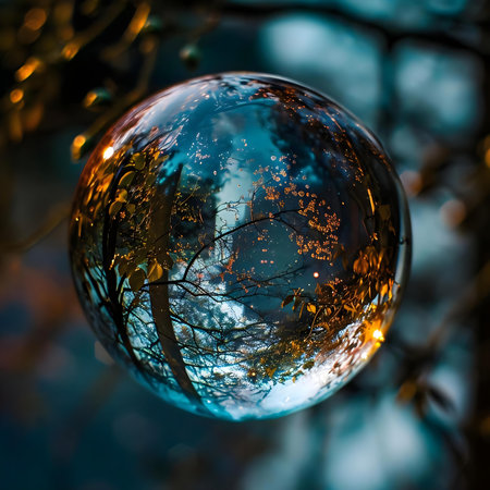 A crystal sphere captures a stunning view of a forest with colorful autumn trees. Clouds linger in the sky, creating a serene atmosphere in this picturesque natural setting.