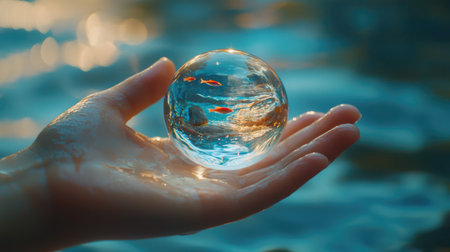 Hands hold a glass sphere that captures an inverted beach and horizon at sunset, resulting in a mirrored tiny landscape with warm color tones and soft bokeh background that emphasizes reflection and close framing