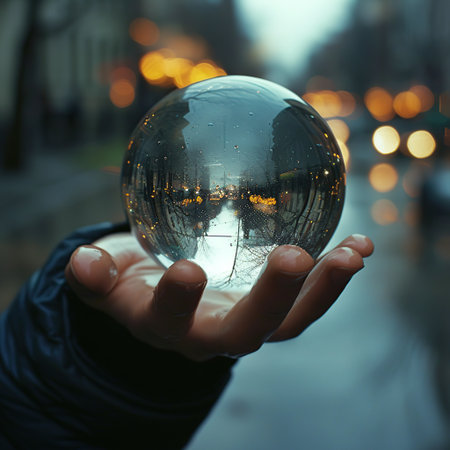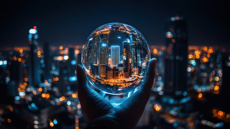 A captivating image of a hand holding a transparent sphere, reflecting a vibrant urban skyline at night, filled with twinkling city lights and creative energy.
