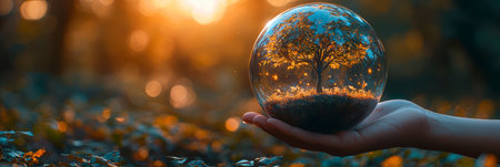Concept illustration of a hand holds a glass sphere with a tree on a forest background, an environmental concept for Earth Day.