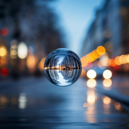 bokeh of city lights captured through a glass sphere, created with generative ai