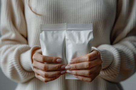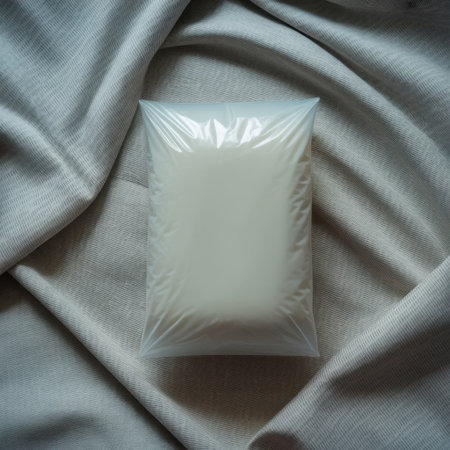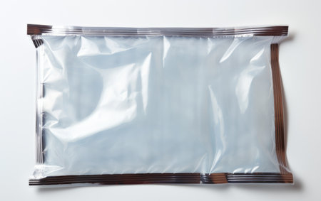 A sealed white plastic pouch is placed on a gray fabric background with a brown surface underneath. The pouch is transparent and empty, showing a clean and minimal