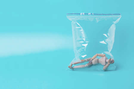 Wooden mannequin in a plastic bag, closed space on a blue background. The concept of depression, quarantine, isolation, phobia