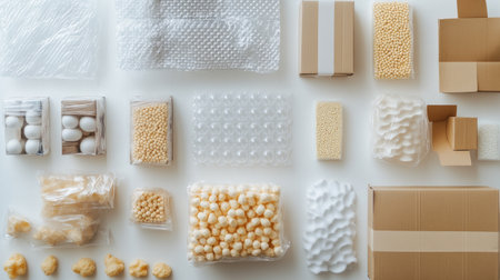Flat lay of assorted packaging materials, from bubble wrap to foam peanuts, showcasing shipping solutions.