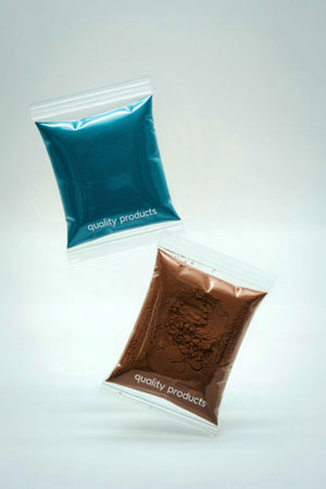 Two sealed pouches, one filled with blue liquid and the other with brown liquid, are suspended in the air against a plain, light-colored backdrop.