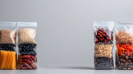 Four clear plastic bags filled with layered dried foods, including grains, beans, pasta, and dried fruits, creating a colorful and textured display.