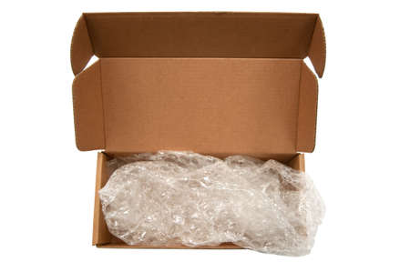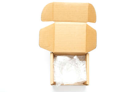 Flatlay picture of open corrugated box with plastic wrap as cushion on isolated white background