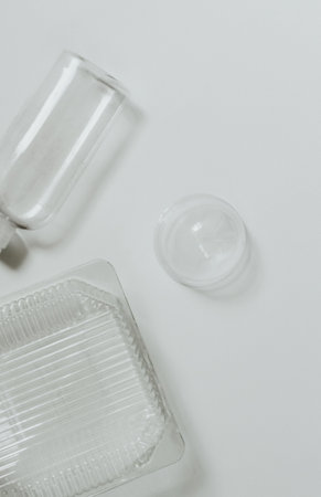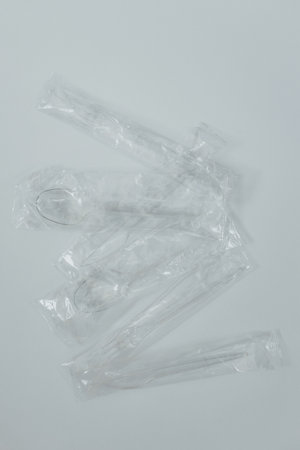 Waste plastic disposable bowls and spoons on a light background. The concept of waste minimization, plastic recycling industry and consumerism. Background with place for text, Top view. Part of a series