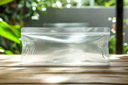 A clear plastic bag sits atop a wooden table, creating a stark contrast between modern and natural materials.