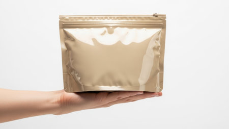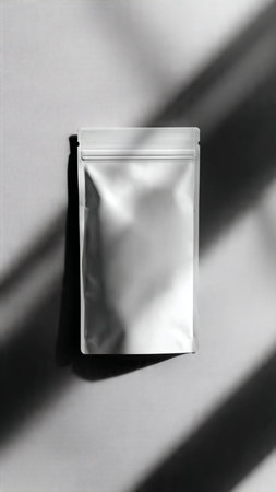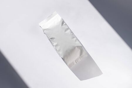 Blank foil food or drink bag on white background in minimal style, natural light shadow. Monochrome photo flat lay. Packaging valve and seal template mockup. Metallic coffee tea retail package design.