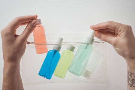 cropped view of woman putting bottles with liquids to cosmetic bag on white background