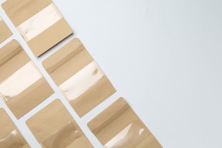 Many kraft stand-up pouches on light background, flat lay. Space for text