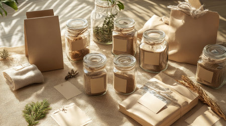 This image showcases a serene flatlay arrangement of jars filled with natural ingredients, paired with plain packaging and earthy textures, perfect for crafting or gifting.