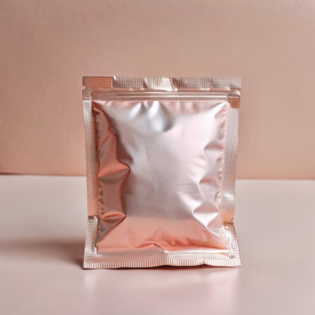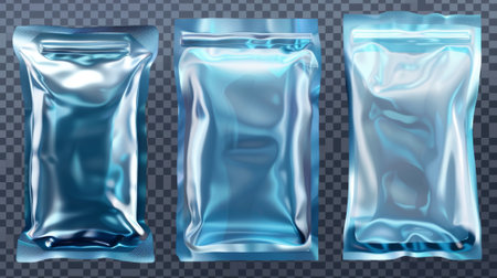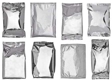 Foil sachet mockup, plastic pouch blank, Shiny silver package for wipe sheet, face mask. Glossy aluminum bag for tea, sugar, candy, biscuit.