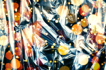Foil background with shiny crumpled surface for texture background with light New Year bokeh