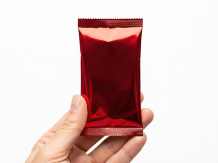 The image features a hand holding a red packet against a white background. The packet is rectangular with a shiny, reflective surface and a textured top and bottom edge. The image is clear and SEO-friendly, emphasizing the visual elements of the red packet and its white background.