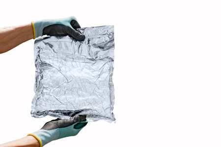 Stock foil paper bag for tea, coffee and grain packaging. Retail shopping and advertising concept. Aluminium coffee package.