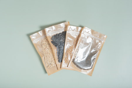 Set for growing sprouts from seeds. Wheat, oats, buckwheat, sunflower seeds lay flat, top view.