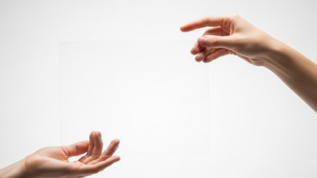 The image shows a pair of hands holding two transparent sheets of paper or plastic. The hands are positioned in front of a plain white background, creating a minimalist and clean visual effect. The transparency of the sheets allows light to pass through, emphasizing the clarity and simplicity of the objects being held.