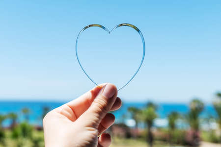 Sea view through shape of heart in the female hand of tropical beach. valentines day. Holiday, holiday concept. Creative, background, copy space, travel, summer.